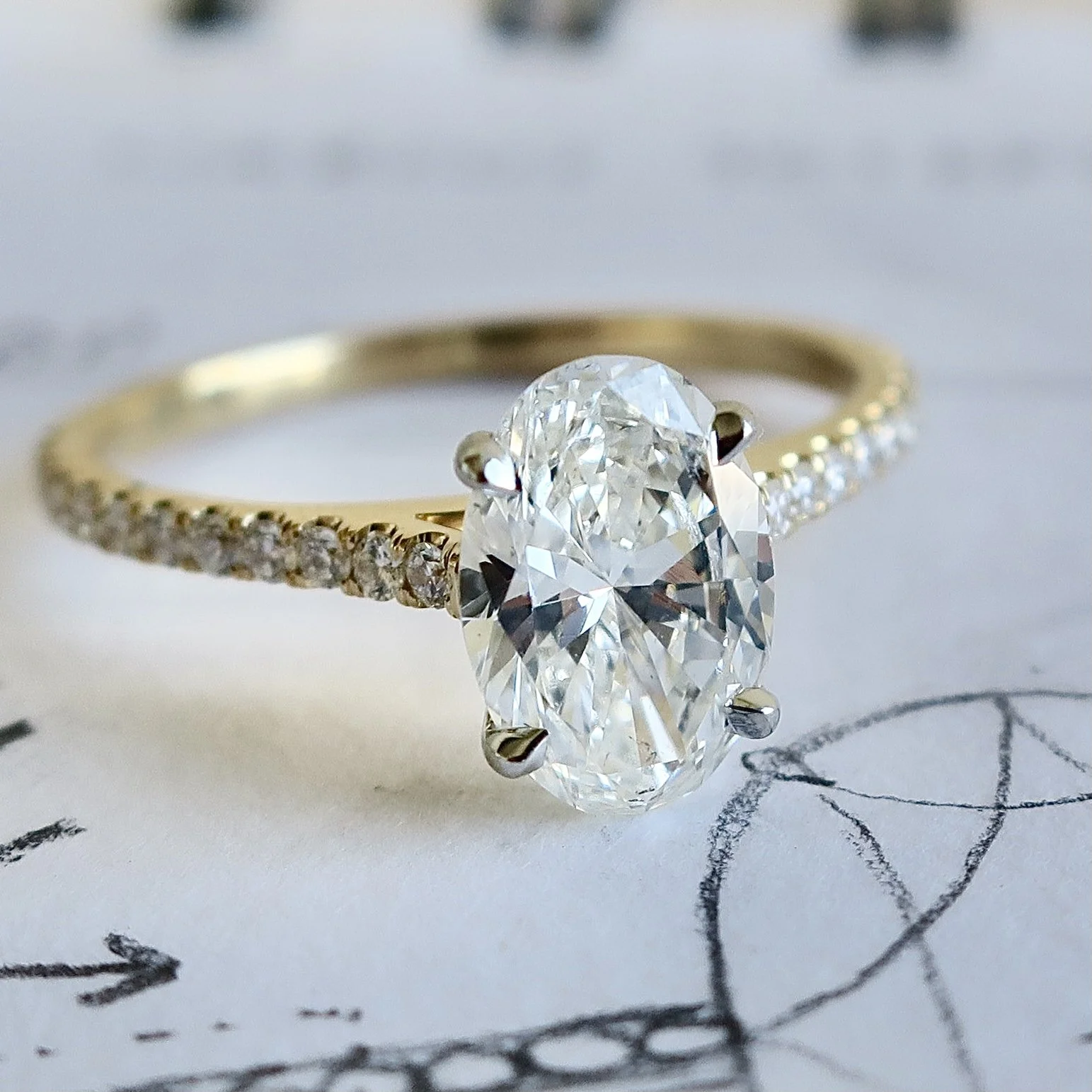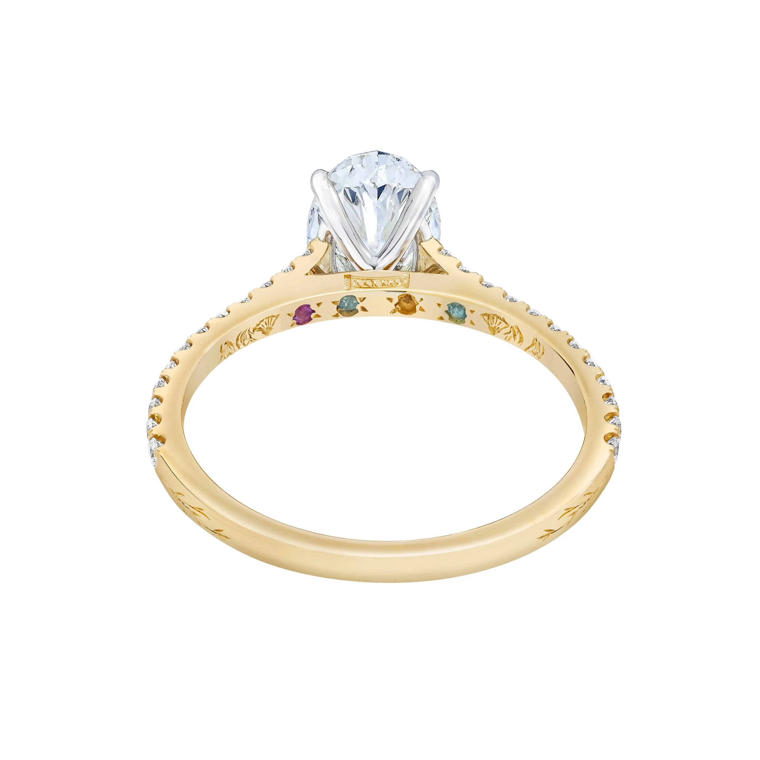 The prongs are inspired by a bow of a sailboat, weaving in their love of adventure and culture. After the last diamond is a carving of the branches from the Farmington Reservoir. Set on the inside of her ring are four gemstones framed by flowers inspired by their favorite wine, S-Bar. Hand-carved on the side profile is a bridge from Big Sur in California.