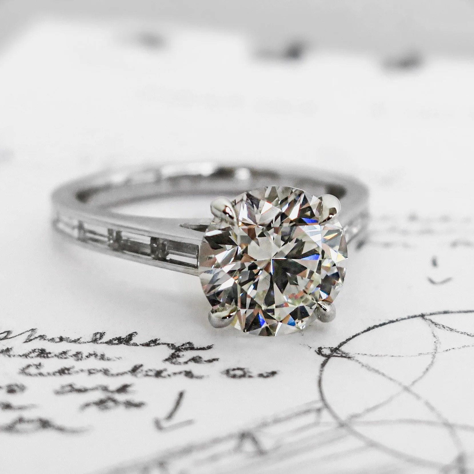 Featuring a round brilliant diamond of maximum fire, life, and brilliance, this is timeless design with a twist. Set into the platinum shoulders are super slim, icy baguettes that perfectly complement the fiery sparkle of the central diamond. There are 5 baguettes on each side of the band, for a total of 11 diamonds on her ring in honor of the month they met. The prongs are inspired by the architecture found in Kyoto, where they spent many trips during the beginning of their relationship. Set on the inside of her ring are four gemstones. The yellow topaz is for when they shared their first kiss, followed by a blue topaz representing a meaningful trip to Nepal. The third gemstone is a pink tourmaline for when he met her family and the final gemstone is a purple amethyst for when he proposed. The gemstones frame the lyrics from “Perfect” written in his handwriting. Hand-carved on the side profile is a pattern found from the Grand Hyatt in Tokyo,