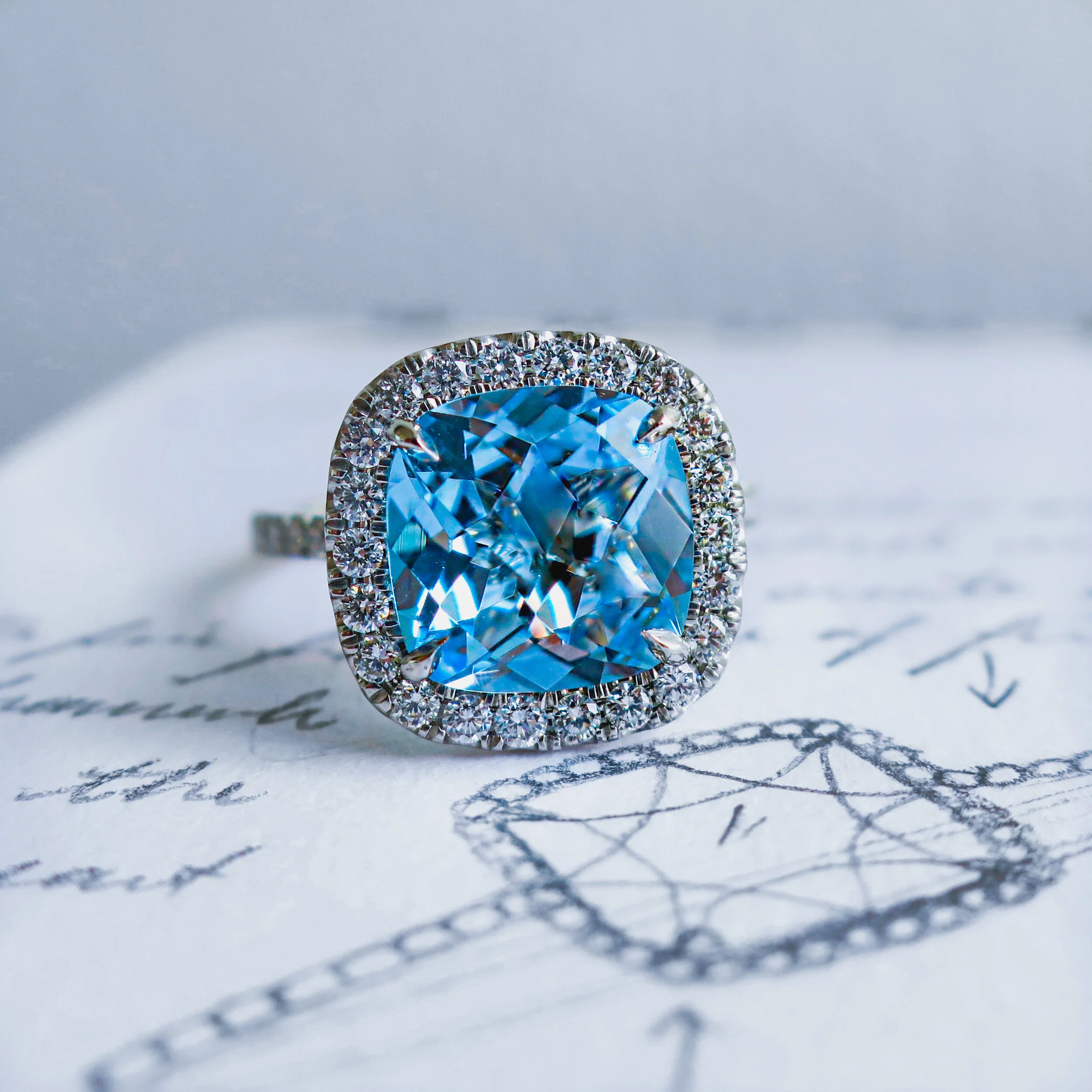 Set on her engagement ring are a total of 13 diamonds for the 13 months they have been together before he proposes. The last 3 diamonds are marked off to represent an epic three day date they had early on in their relationship. The prongs are inspired by the Cattleya Labiata, the national flower of Brazil, where she is from. Set on the inside of her ring are four gemstones, a pink tourmaline for when they met outside of Flaming Saddles in New York City, a burgundy garnet for a moment at the airport which was important to him, when he started to view her as his future wife. Next, a green tourmaline for when he met her family in Porto Alegre, Brazil, where she is from. The final gemstone is yellow topaz for when he proposed to her. The gemstones are framed by a carving from Barcade in New York City, where they had a special date early on, as well as on their first year anniversary. At the center of the gemstones are the words “come what may” from the musical movie Moulin Rouge. This is a song which she asks him to sing to her. Carved on the side profile is a stuffed animal, Faroafa, which is important to both of them. She gave this stuffed animal to him and it represents “home” to them.