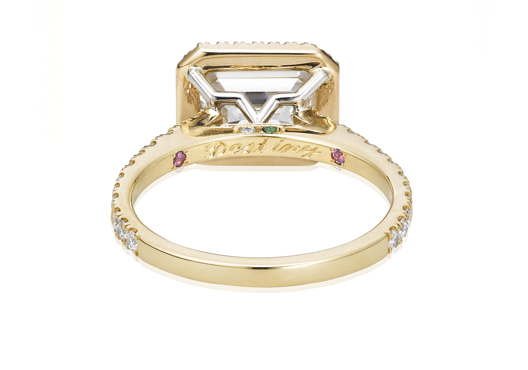 The Destiny Ring features an emerald cut diamond set in yellow gold.