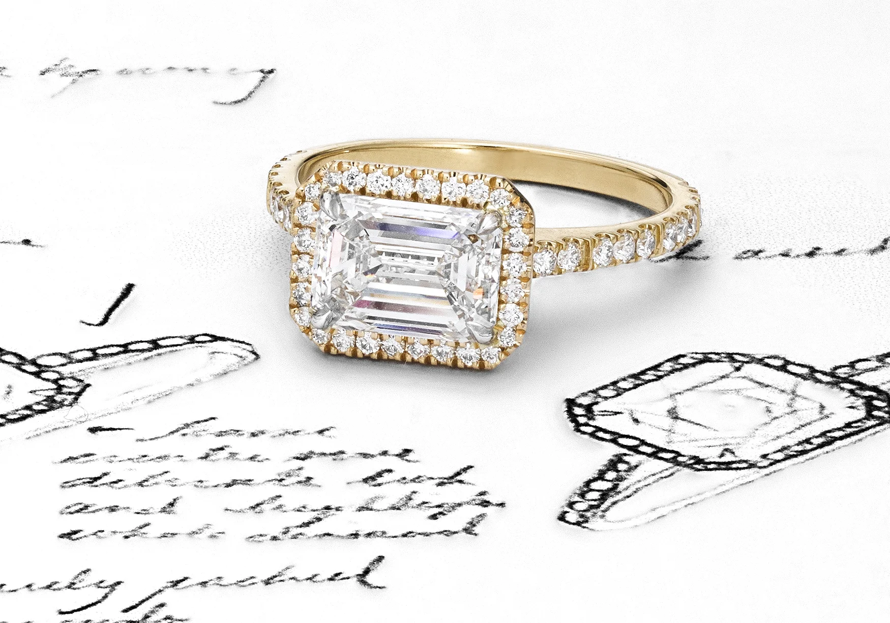 This unique design was the first of its kind: an incredible emerald-cut diamond set horizontally and surrounded by a delicate frame of diamonds for maximum sparkle. The prongs were hand sculpted to evoke the Four Seasons resort in Jackson, Wyoming to commemorate an unforgettable trip. Hidden gemstones set on each side of a hand-carving celebrate the moment they met and the moment he asked her to be his wife.